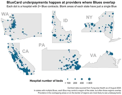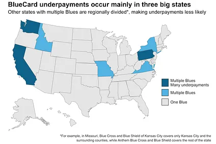 The remaining states with multiple Blues are artifacts of history. They either had separate Blue Cross and Blue Shield companies that never merged (California, Idaho, Washington), or had multiple regional plans that remained distinct (Pennsylvania, New York, Missouri, etc.). When BlueCard arrived in 1994, those unmerged Blues became seeds for the underpayment arbitrage that sprang up 20+ years later.
