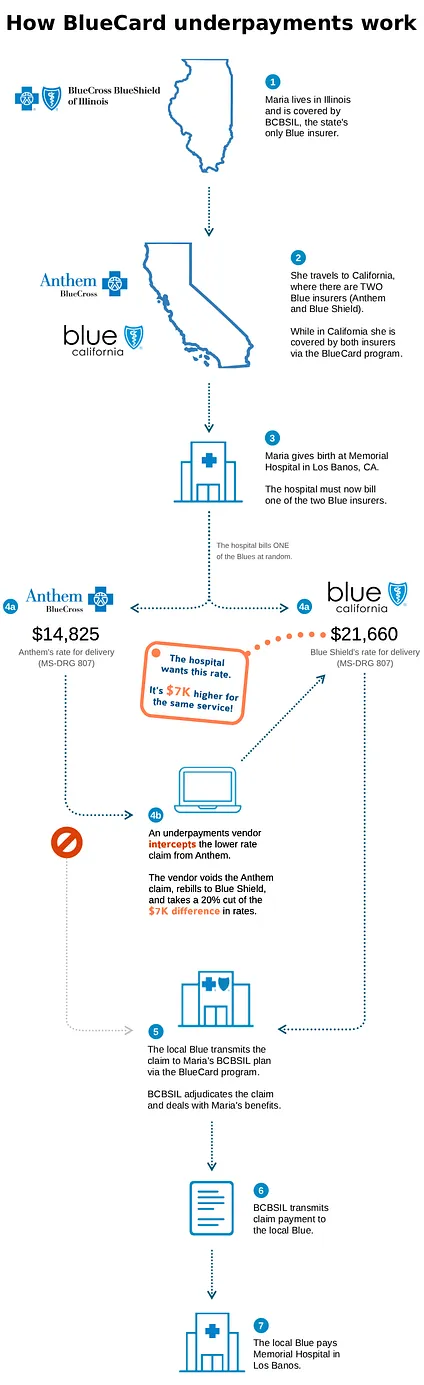 BlueCard underpayments are a symptom of the complexity of U.S. healthcare. Their existence stems from the tangled history of the Blues, the accumulated complexity of the healthcare revenue cycle, and the constant need for providers to find revenue.