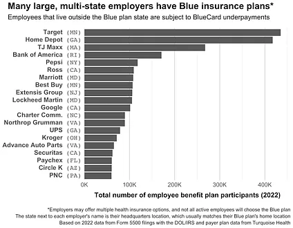 Note, however, that not all these employees will have a Blue plan, as many large employers offer plans from multiple insurers (e.g. Target employees in California can get Kaiser). Further, some employer Blue plans require providers to submit claims to a specific local Blue. For example, in Washington state, Boeing (headquartered in VA) has an agreement that requires all BlueCard claims to flow through Regence, negating the possibility of underpayments for their employees.