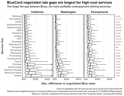 What vendors really want are the big, yet-to-be-closed rate gaps for obscure, expensive care. The plot below shows the distribution of rate gaps between Blues by service line in the three major BlueCard underpayment states.