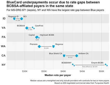 But vendors using this scheme don’t make money through volume (i.e. rebilling lots of small claims). Instead, they seek out expensive claims with big rate gaps between Blues. Those claims tend to be for things like long inpatient stays, surgeries, or complex treatments. For example, here’s the gap in median rates across Blues for MS-DRG 871 (sepsis with MCC):
