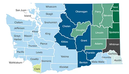The regional overlaps get extremely messy. Here’s a map showing how just two Blues split coverage of Washington state. The light blue and green areas show the overlapping service area, while the other colors show permutations of coverage from different single Blues. You can see the light blue area roughly mirrors the area with many dots from the map above.
