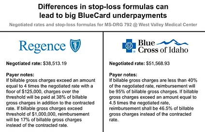 Stop-loss clauses are added to contracts to protect providers from the unknown cost of expensive, high-intensity care like traumatic injuries, major complications, and pre-term births. However, stop-loss payment methods/percentages can vary significantly by payer, creating huge opportunities for BlueCard arbitrage. For example, here are some real reimbursement rates and stop-loss clauses for a premature birth without major problems (MS-DRG 792) from West Valley Medical Center in Idaho: