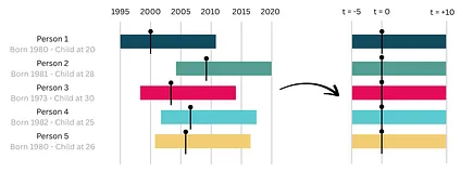 How does an event study work? The idea is to line all of our observations up around “the event” which is the birth of the first child. In the data that the authors are using for this paper, there are lots of different individuals who we track over time and who have their first child at different ages. We define t=0 as the year of childbirth and look at everyone’s earnings in the 5 years before childbirth and the 10 years after childbirth. Here is a visualisation of how we line up observations from different people to get event times:
