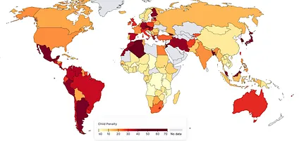 The child penalty in employment across the world. The scale is in % and shows the average drop in employment for women relative to men in the 10 years after childbirth. Source: Child Penalty Atlas